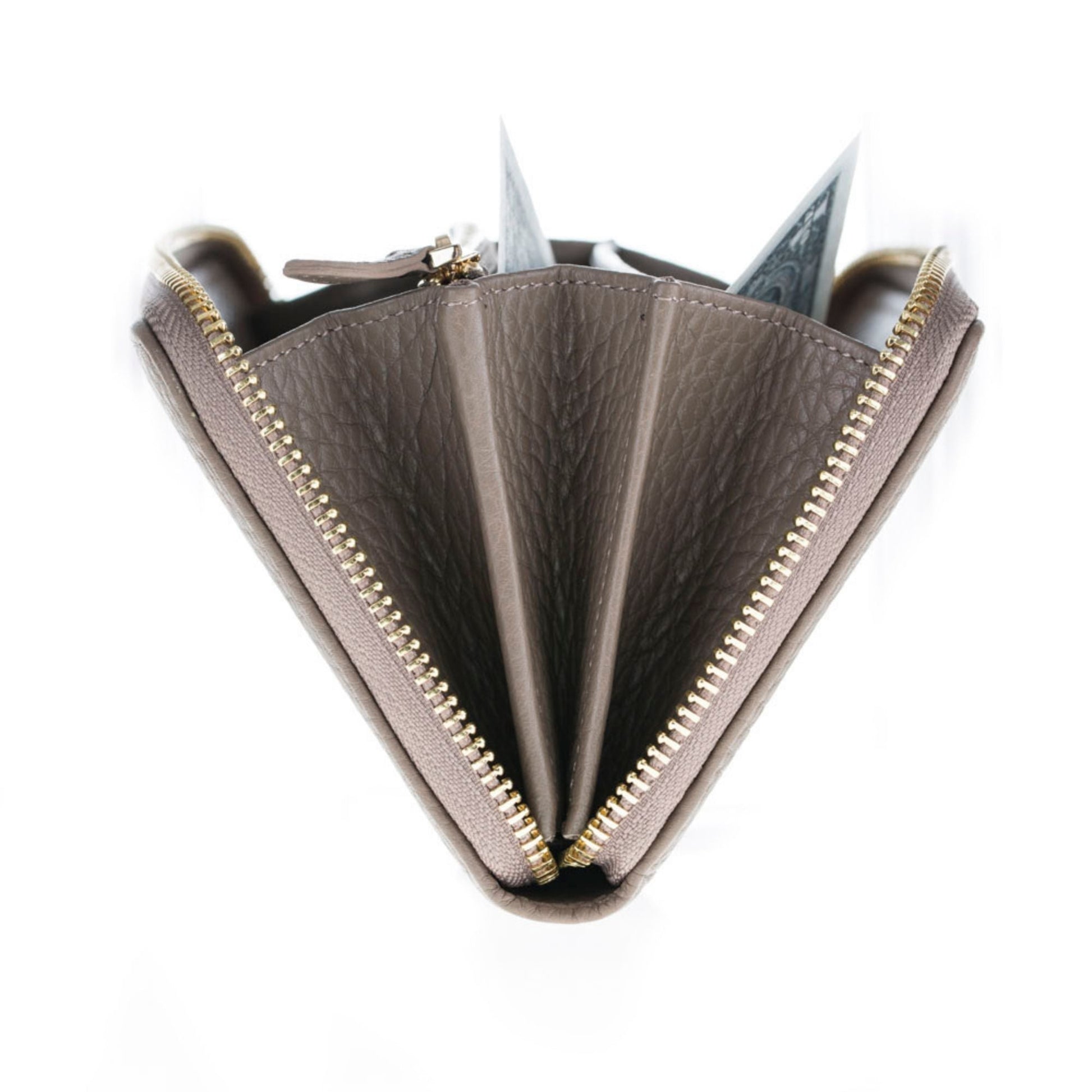 - Gold-colored zippers